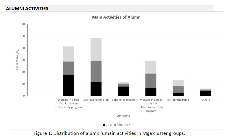 Based on the graph of alumni activities, the majority of graduates from the three groups (UGM, Agro, and FKT) are employed in fields relevant to their study programs, with UGM showing the highest proportion in this category. Nevertheless, a considerable number of alumni remain unemployed or are seeking jobs, particularly from the Agro and FKT groups. Only a small proportion of alumni pursue further studies, with UGM and Agro slightly higher than FKT. Some alumni are read more