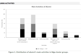 Based on the graph of alumni activities, the majority of graduates from the three groups (UGM, Agro, and FKT) are employed in fields relevant to their study programs, with UGM showing the highest proportion in this category. Nevertheless, a considerable number of alumni remain unemployed or are seeking jobs, particularly from the Agro and FKT groups. Only a small proportion of alumni pursue further studies, with UGM and Agro slightly higher than FKT. Some alumni are read more